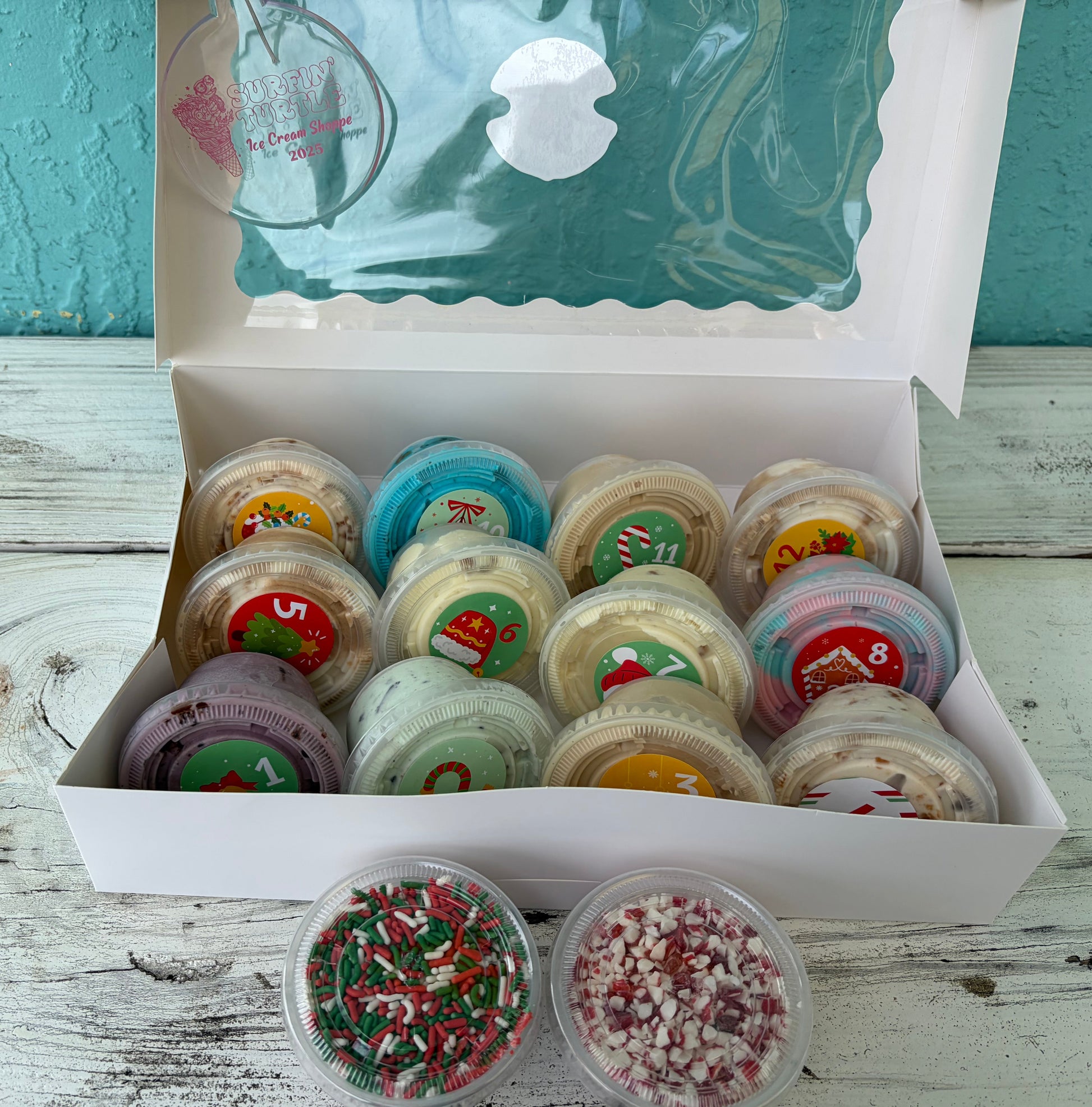 Enjoy 12 days of Christmas Countdown Calendar! Count down to Christmas each day with a 4 oz cup of a surprise flavor from Surfin’ Turtle! This will include 12 4 oz containers of ice cream, peppermint pieces, Christmas sprinkles, and a limited Surfin’ Turtle ornament! At check out pick out a pick up date!